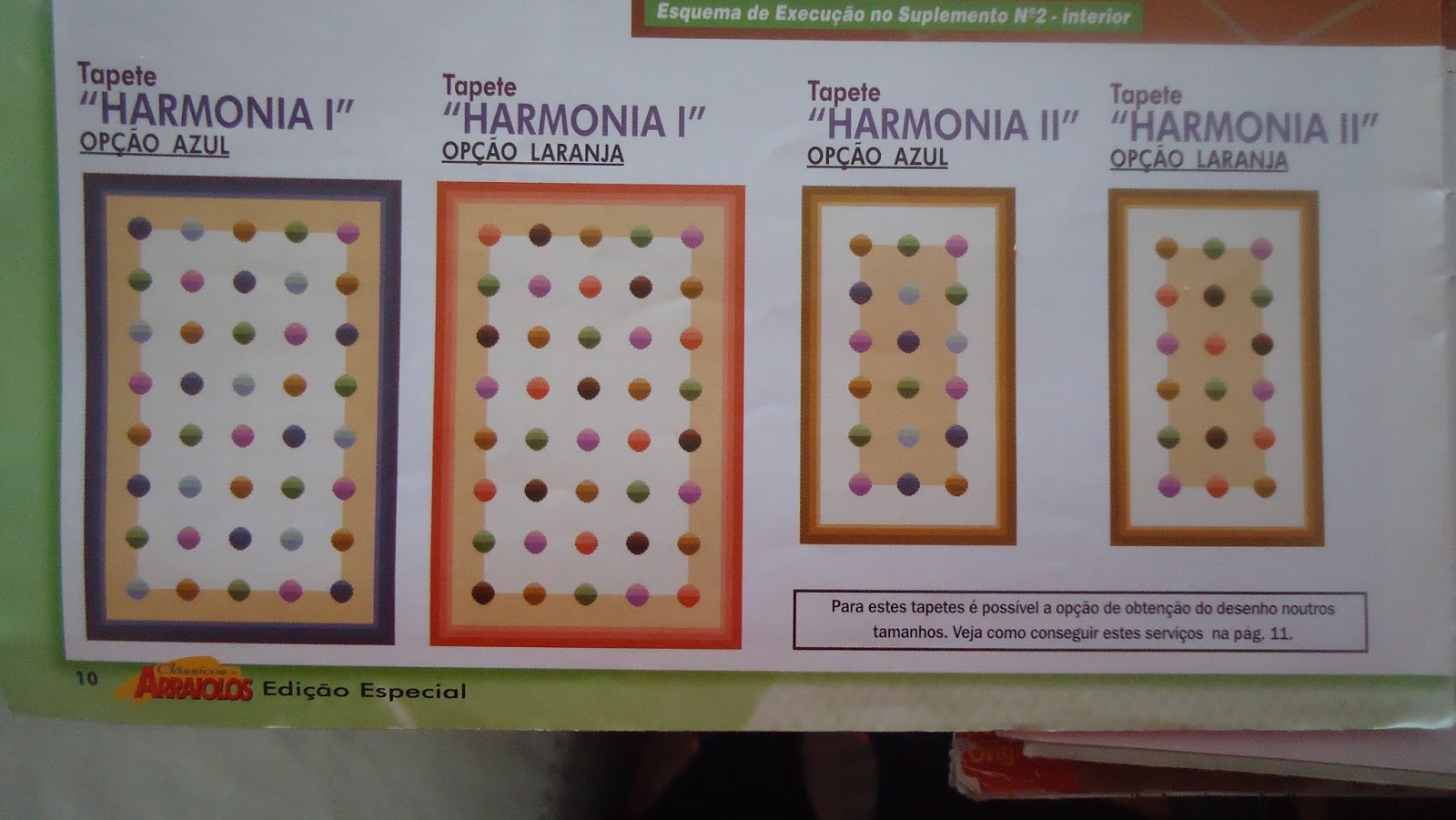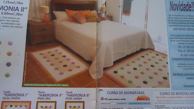 A fotografia mostrava que o tapete do fundo da cama era maior e com cores diferentes dos laterais - podia também brincar com isso. Decidi não fazer o tamanho grande mas brincar com as cores. Caso queiram nesta revista também é possível pedir desenhos com tamanhos diferentes, para ficar de acordo com os tamanhos para nossa casa - no meu caso não valia a pena, o tamanho do tapete pequeno bastava.